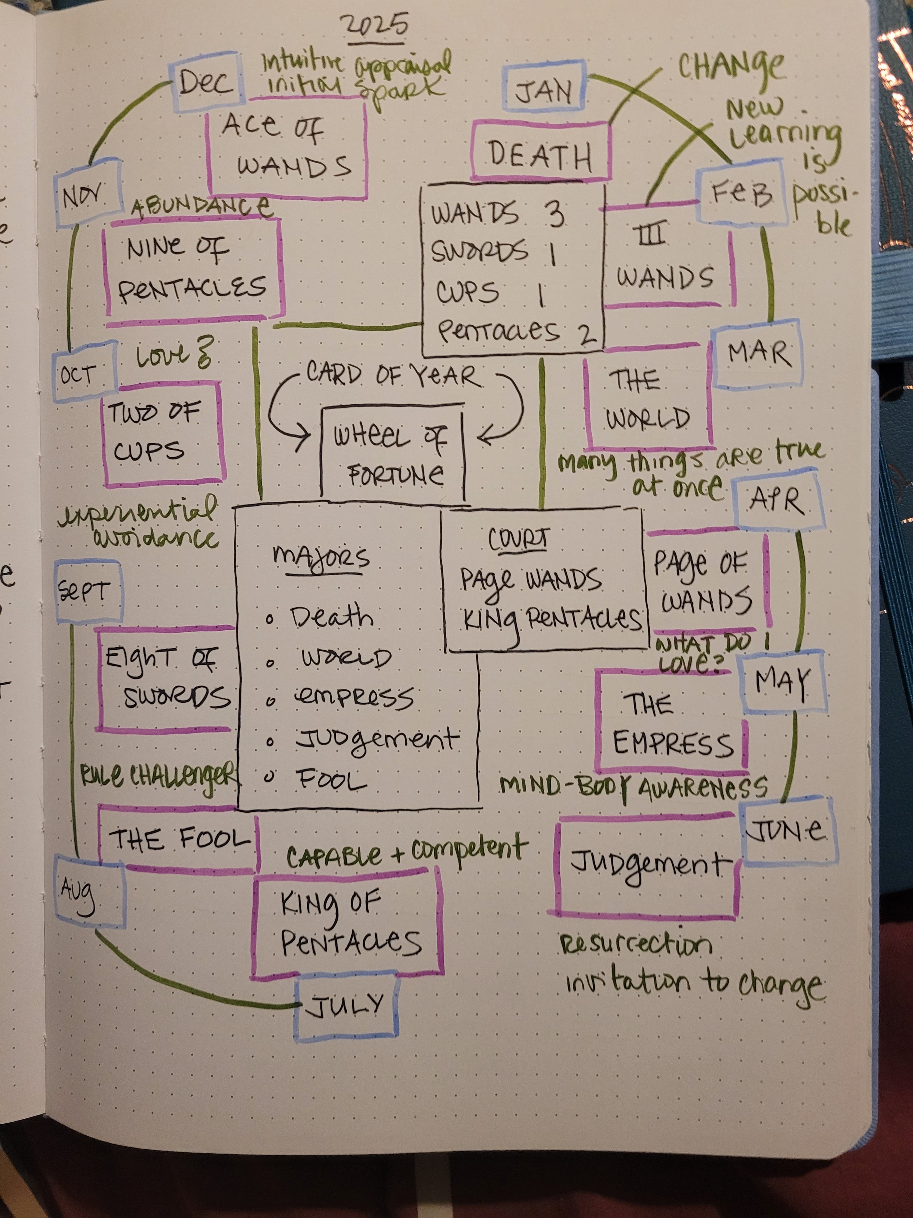 I wrote last week about Death and how I think that may be my card for the year. But that strikes me now as too easy and also perhaps not very helpful for me. 2025 has been a Death year, a Tower year, a Devil year, the three cards we most fear. The card I chose last year was The Wheel of Fortune. Below are the notes I took from my own spread.